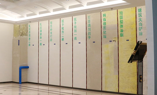 建筑大白鏟除→墻固整體涂刷→特殊墻面處理→石膏滿刮找平→膩?zhàn)优我槐?rarr;膩?zhàn)优味?rarr;墻面砂光打磨→乳膠漆滾涂第一遍→乳膠漆滾涂第二遍