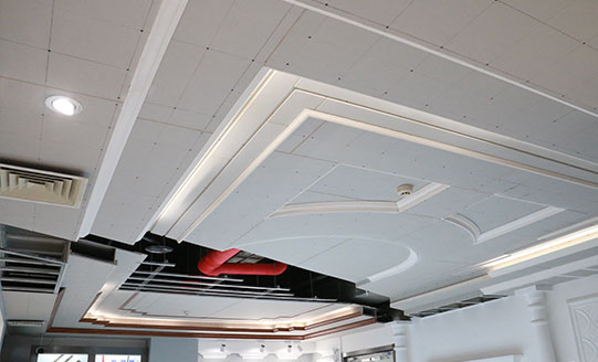 吊頂使用輕鋼龍骨,特殊異性采用局部木龍骨搭配,自攻釘固定,輕鋼龍骨防火防潮,石膏板于龍骨接縫錯(cuò)開(kāi),避免開(kāi)裂,邊棚拐角T形整板切割防止開(kāi)裂。